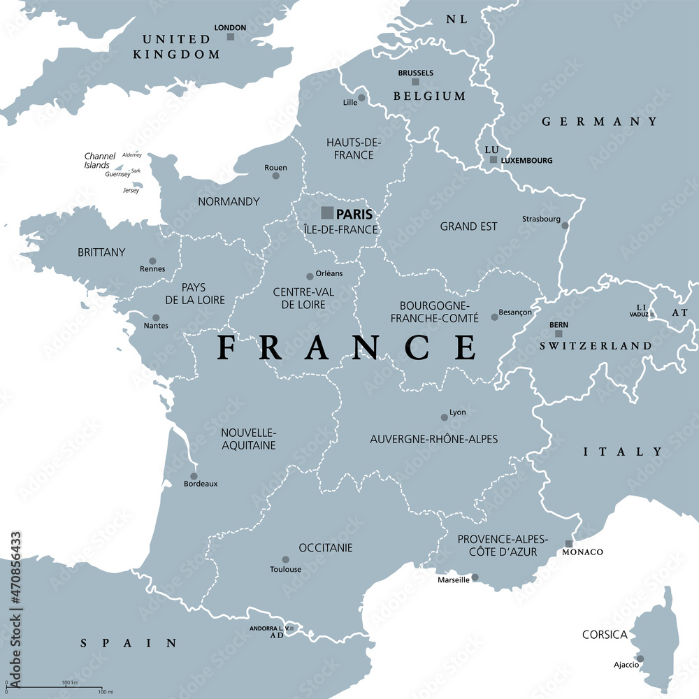 France, metropolitan regions, gray political map. French Republic